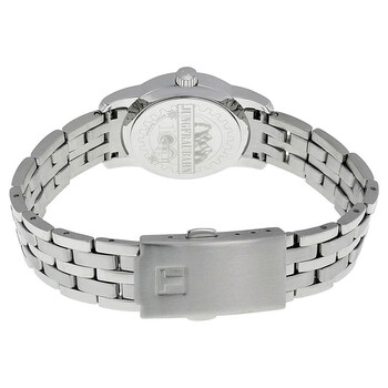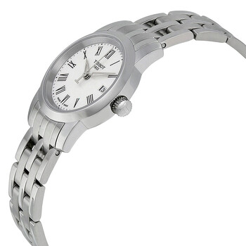 Stainless steel case with a stainless steel bracelet. Fixed stainless steel bezel. Silver dial with silver-tone hands and Roman numeral hour markers. Minute markers around the outer rim. Dial Type: Analog. Luminescent hands. Date display at the 3 o'clock position. Quartz movement. Scratch resistant sapphire crystal. Pull / push crown. Solid case back. Case diameter: 32 mm. Round case shape. Deployment clasp with a push button release. Water resistant at 30 meters / 100 feet. Functions: date, hour, minute, second. Dress watch style. Watch label: Swiss Made. Tissot Classic Dream Jungfraubahn White Dial Stainless Steel Ladies Watch T0332101101310.