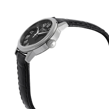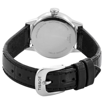 Stainless steel case with a black leather strap. Fixed stainless steel bezel. Black dial with silver-tone hands and Roman numeral hour markers. Arabic numeral minute markers (at 5 minute intervals). Dial Type: Analog. Date display at the 3 o'clock position. Quartz movement. Scratch resistant sapphire crystal. Pull / push crown. Solid case back. Round case shape. Case size: 28 mm. Case thickness: 7.1 mm. Band width: 14 mm. Tang clasp. Water resistant at 50 meters / 165 feet. Functions: date, hour, minute, second. Classic Dream Lady Series. Dress watch style. Watch label: Swiss Made. Tissot Classic Dream Lady Quartz Black Dial Watch T129.210.16.053.00.