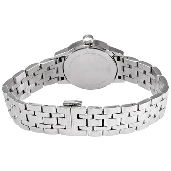 Stainless steel case with a stainless steel bracelet. Fixed stainless steel bezel. White dial with silver-tone hands and Roman numeral hour markers. Minute markers around the outer rim. Dial Type: Analog. Date display at the 3 o'clock position. Quartz movement. Scratch resistant sapphire crystal. Pull / push crown. Solid case back. Round case shape. Case size: 28 mm. Case thickness: 7.1 mm. Band width: 14 mm. Butterfly clasp with a push button release. Water resistant at 50 meters / 165 feet. Functions: date, hour, minute, second. Classic Dream Lady Series. Casual watch style. Watch label: Swiss Made. Tissot Classic Dream Lady Quartz White Dial Ladies Watch T129.210.11.013.00.