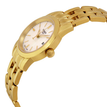 Gold-tone stainless steel case and bracelet. Fixed gold-tone bezel. Mother of pearl dial with gold-tone hands and index hour markers. Minute markers around the outer rim. Dial Type: Analog. Luminescent hands. Date display at the 3 o'clock position. Quartz movement. Scratch resistant sapphire crystal. Pull / push crown. Solid case back. Case diameter: 28 mm. Case thickness: 8 mm. Round case shape. Band width: 17.8 mm. Band length: 7 inches. Deployment clasp. Water resistant at 30 meters / 100 feet. Functions: date, hour, minute, second. Casual watch style. Watch label: Swiss Made. Item Variations: T033 210 33 111 00, T033-210-33-111-00, T033/210/33/111/00, T0332103311100. Tissot Classic Dream Mother of Pearl Dial Gold-tone Ladies Watch T0332103311100.