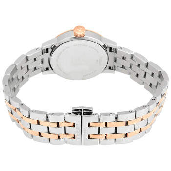 Rose gold PVD stainless steel case with a two-tone (silver-tone and rose gold PVD) stainless steel bracelet. Fixed rose gold PVD stainless steel bezel. White dial with black hands and Roman numeral hour markers. Arabic numeral minute markers (at 5 minute intervals). Dial Type: Analog. Date display at the 3 o'clock position. ETA Caliber F04.115 quartz movement. Scratch resistant sapphire crystal. Pull / push crown. Solid case back. Round case shape, case size: 28 mm, case thickness: 7.1 mm. Band width: 14 mm. Deployment with push button release clasp. Water resistant at 50 meters / 165 feet. Functions: date, hour, minute, second. Classic Dream Series. Dress watch style. Watch label: Swiss Made. Tissot Classic Dream Quartz White Dial Ladies Watch T129.210.22.013.00.