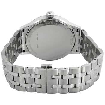 Stainless steel case and a stainless steel bracelet. Fixed stainless steel bezel. White dial with silver-tone hands and Roman numeral hour markers. Arabic numeral minute markers (at 5 minute intervals). Dial Type: Analog. Date display at the 3 o'clock position. ETA caliber F06.115 quartz movement. Scratch resistant sapphire crystal. Pull / push crown. Solid case back. Round case shape. Case size: 42 mm. Case thickness: 8.1 mm. Band width: 22 mm. Deployment clasp with a push button release. Water resistant at 50 meters / 165 feet. Functions: date, hour, minute, second, battery eol indicator. Classic Dream Series. Casual watch style. Watch label: Swiss Made. Tissot Classic Dream Quartz White Dial Men's Watch T129.410.11.013.00.