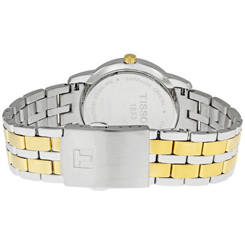 Stainless steel case with a two-tone (silver and gold-tone) stainless steel bracelet. Fixed stainless steel bezel. White dial with luminous gold-tone hands and stick hour markers. Minute markers around the outer rim. Dial Type: Analog. Luminescent hands and markers. Date display at the 3 o'clock position. Swiss quartz movement. Scratch resistant sapphire crystal. Solid case back. Case diameter: 38 mm. Band length: 7 inches. Deployment clasp with a push button release. Water resistant at 30 meters / 100 feet. Functions: hours, minutes, seconds, date. Casual watch style. Tissot Classic Dream Two-tone Men's Watch T0334102201100.