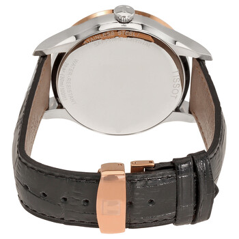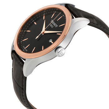 Silver-tone stainless steel case with a black leather strap. Fixed 18kt rose gold PVD gold bezel. Black dial with rose gold-tone hands and Roman numeral hour markers. Minute markers around the outer rim. Dial Type: Analog. Date display at the 3 o'clock position. Quartz movement. Scratch resistant sapphire crystal. Pull / push crown. Transparent case back. Case size: 42 mm. Case thickness: 9.45 mm. Round case shape. Band width: 20.3 mm. Band length: 8 inches. Fold over clasp. Water resistant at 30 meters / 100 feet. Functions: date, hour, minute, second. Casual watch style. Watch label: Swiss Made. Tissot Classic Automatic Men's Watch T912.410.46.051.00.