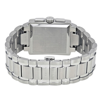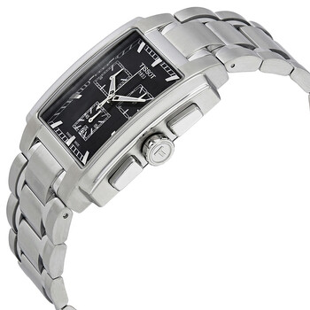 Stainless steel case with a stainless steel bracelet. Fixed stainless steel bezel. Black dial with luminous silver-tone hands and index hour markers. Minute markers around the outer rim. Dial Type: Analog. Luminescent hands and markers. Date display at the 6 o'clock position. Chronograph - three sub-dials displaying: 60 second, 30 minute and 1/10th of a second. ETA caliber G15.211 quartz movement. Scratch resistant sapphire crystal. Solid case back. Case dimensions: 38 mm x 33 mm. Case thickness: 12 mm. Rectangle case shape. Band width: 21 mm. Band length: 8 inches. Fold over clasp. Water resistant at 100 meters / 330 feet. Functions: chronograph, date, hour, minute, second. Casual watch style. Watch label: Swiss Made. Item Variations: T0617171105100. Tissot Classic TXL Chronograph Black Dial Stainless Steel Men's Watch T061.717.11.051.00.