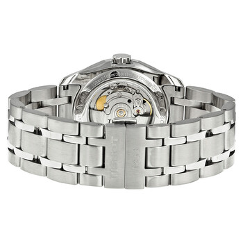 Stainless steel case with a stainless steel bracelet. Fixed stainless steel bezel. Black dial with silver-tone dauphine-style hands and index hour markers. Dial Type: Analog. Date display at the 9 o'clock position. Small second sub-dial. ETA caliber 2825-2 automatic movement, based upon ETA 2824-2, containing 25 Jewels, bitting at 28800 vph, and has a power reserve of approximately 42 hours. Scratch resistant sapphire crystal. Pull / push crown. Skeleton case back. Round case shape. Case size: 39 mm. Case thickness: 10 mm. Band width: 20 mm. Band length: 7.75 inches. Deployment clasp. Water resistant at 100 meters / 330 feet. Functions: date, hour, minute, small second. Casual watch style. Watch label: Swiss Made. Item Variations: T0354281105100. Tissot Couturier Automatic Black Dial Men's Watch T035.428.11.051.00.