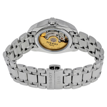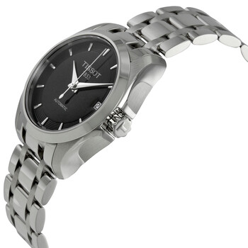 Stainless steel case with a stainless steel bracelet. Fixed stainless steel bezel. Black dial with silver-tone hands and index hour markers. Dial Type: Analog. Date display at the 3 o'clock position. Automatic movement. Caliber eta 2824-2 engine. Scratch resistant sapphire crystal. Pull / push crown. Skeleton case back. Case diameter: 32 mm. Case thickness: 10 mm. Round case shape. Band width: 18 mm. Fold over clasp with safety release. Water resistant at 300 meters / 1000 feet. Functions: date, hour, minute, second. Casual watch style. Item Variations: T035 207 11 051 00, T035-207-11-051-00, T035/207/11/051/00, T0352071105100. Tissot Couturier Automatic Black Dial Stainless Steel Ladies Watch T0352071105100.