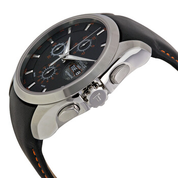 Stainless steel case with a black leather strap. Fixed stainless steel bezel. Black dial with silver-tone hands and index hour markers. Tachymeter around the outer rim. Dial Type: Analog. Luminescent hands and markers. Day of the week and date display at the 3 o'clock position. Chronograph - three sub-dials displaying: 60 second, 30 minute and 12 hour. Automatic movement with a 42 hour power reserve. Scratch resistant anti-reflective sapphire crystal. Skeleton case back. Case diameter: 43 mm. Case thickness: 14.1 mm. Round case shape. Strap width: 24 mm. Deployment clasp. Water resistant at 100 meters/ 330 feet. Functions: hours, minutes, seconds, day and date. Dress watch style. Watch label: Swiss made. Item Variations: T0356141605101. Tissot Couturier Chronograph Valjoux Black Dial Black Leather Men's Watch T035.614.16.051.01.