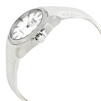 Stainless steel case with a white leather strap. Fixed stainless steel bezel. Mother of pearl dial with silver-tone dauphine-style hands and diamond-set index hour markers. Minute markers around the outer rim. Dial Type: Analog. Date display at the 3 o'clock position. Tissot calibre Powermatic 80 (C07.111) automatic movement, based upon ETA 2824-2, containing 23 Jewels, bitting at 21600 vph, and has a power reserve of approximately 80 hours. Scratch resistant sapphire crystal. Pull / push crown. Transparent case back. Round case shape. Case size: 32 mm. Case thickness: 10.1 mm. Band width: 18 mm. Butterfly clasp. Water resistant at 100 meters / 330 feet. Functions: date, hour, minute, second. Casual watch style. Watch label: Swiss Made. Tissot Couturier Lady Powermatic 80 Automatic Ladies Watch T035.207.16.116.00.