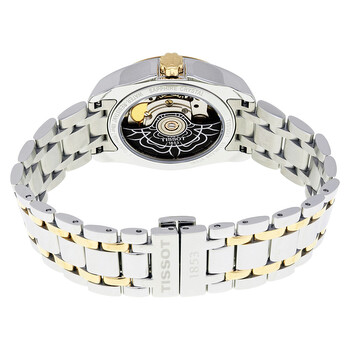 Stainless steel case with a two-tone (silver-tone and yellow gold PVD) stainless steel bracelet. Fixed yellow gold PVD bezel. Silver dial with yellow gold-tone dauphine-style hands and index hour markers. Minute markers around the outer rim. Dial Type: Analog. Luminescent hands and markers. Date display at the 3 o'clock position. Tissot calibre Powermatic 80 (C07.111) automatic movement, based upon ETA 2824-2, containing 23 Jewels, bitting at 21600 vph, and has a power reserve of approximately 80 hours. Scratch resistant sapphire crystal. Transparent case back. Round case shape. Case size: 32 mm. Case thickness: 10 mm. Band width: 18 mm. Butterfly clasp. Water resistant at 100 meters / 330 feet. Functions: date, hour, minute, second. Luxury watch style. Watch label: Swiss Made. Tissot Couturier Powermatic 80 Ladies Watch T035.207.22.031.00.