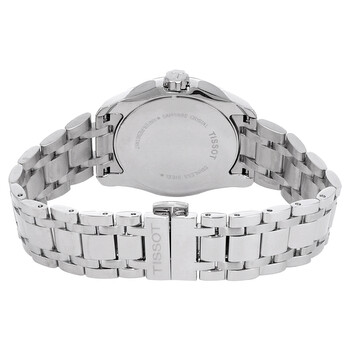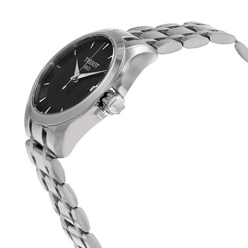 Stainless steel case with a stainless steel bracelet. Fixed stainless steel bezel. Black dial with silver-tone hands and index hour markers. Dial Type: Analog. Date display at the 3 o'clock position. ETA F05.111 quartz movement. Scratch resistant sapphire crystal. Solid case back. Round case shape. Case size: 32 mm. Case thickness: 8.1 mm. Band width: 18 mm. Deployment clasp with a push button release. Water resistant at 100 meters / 330 feet. Functions: date, hour, minute, second. Couturier Series. Casual watch style. Watch label: Swiss Made. Tissot Couturier Quartz Black Dial Ladies Watch T035.210.11.051.01.