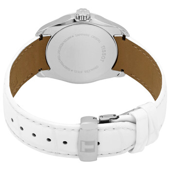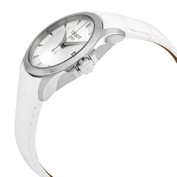 Stainless steel case with a white leather strap. Fixed stainless steel bezel. Silver dial with silver-tone hands and index hour markers. Dial Type: Analog. Date display at the 3 o'clock position. Caliber F05.111 quartz movement. Scratch resistant sapphire crystal. Pull / push crown. Solid case back. Round case shape. Case size: 32 mm. Case thickness: 8 mm. Fold over clasp. Water resistant at 100 meters / 330 feet. Functions: date, hour, minute, second. Couturier Series. Casual watch style. Watch label: Swiss Made. Tissot Couturier Quartz Silver Dial Ladies Watch T035.210.16.031.00.