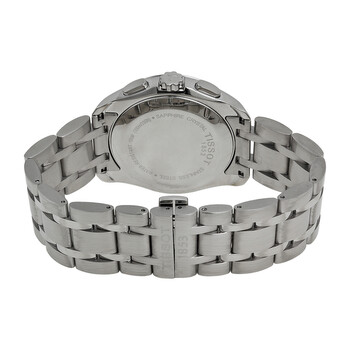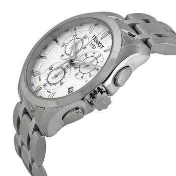Stainless steel case with a stainless steel bracelet. Fixed stainless steel bezel. Silver dial with luminous hands and index hour markers. Tachymeter scale around the outer rim. Date display appears at the 4 o'clock position. Chronograph - three sub-dials displaying: 1/10th of a second, 30 minutes and 60 seconds. Swiss quartz movement. Scratch resistant sapphire crystal. Push / pull crown. Solid case back. Case diameter: 41 mm. Case thickness : 10.8 mm. Deployment clasp. Water resistant at 100 meters/ 330 feet. Functions: hours, minutes, seconds, calendar, chronograph, tachymeter. Tissot Couturier Stainless Steel Men's Watch T0356171103100.