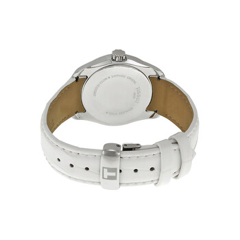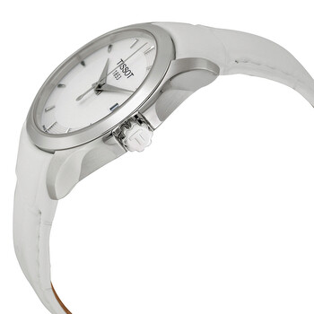Stainless steel case with a white (calfskin) leather strap. Fixed stainless steel bezel. White dial with silver-tone hands and index hour markers. Dial Type: Analog. Date display at the 3 o'clock position. ETA F05.111 quartz movement. Scratch resistant sapphire crystal. Push / pull crown. Solid case back. Case size: 32 mm. Case thickness: 8 mm. Round case shape. Band width: 14 mm. Butterfly clasp. Water resistant at 100 meters / 330 feet. Functions: date, hour, minute, second. Casual watch style. Watch label: Swiss Made. Tissot Couturier White Dial Ladies Watch T0352101601100.