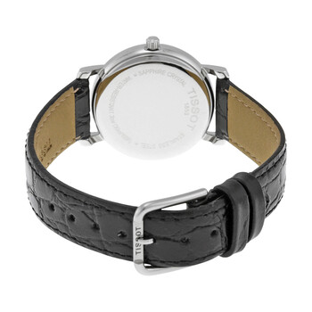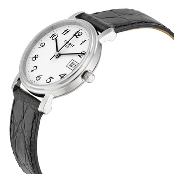 Stainless steel case with a black leather strap. Fixed stainless steel bezel. White dial with black hands and Arabic numeral hour markers. Minute markers around the outer rim. Dial Type: Analog. Date display at the 3 o'clock position. ETA 956.412 quartz movement. Scratch resistant sapphire crystal. Pull / push crown. Solid case back. Case size: 27 mm. Case thickness: 6 mm. Round case shape. Band width: 14 mm. Tang clasp. Water resistant at 30 meters / 100 feet. Functions: date, hour, minute, second. Casual watch style. Watch label: Swiss Made. Item Variations: T52 1 121 12, T52-1-121-12, T52/1/121/12, T52112112. Tissot Desire White Dial Black Leather Ladies Watch T52.1.121.12.