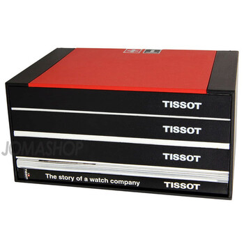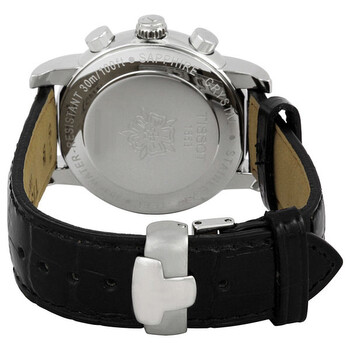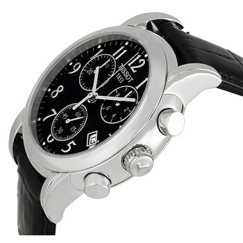 Stainless steel case with a black (calfskin) leather strap. Fixed stainless steel bezel. Black dial with silver-tone hands and Arabic numerals hour markers. Minute markers around the outer rim. Dial Type: Analog. Luminescent hands and markers. Date display at the 4 o'clock position. Chronograph - three sub-dials displaying: 60 seconds, 30 minutes and 1/10th of a second. ETA caliber G15.211 quartz movement. Scratch resistant mineral crystal. Steel crown. Solid case back. Case size: 35 mm. Case thickness: 10 mm. Round case shape. Band width: 19 mm. Fold over clasp. Water resistant at 30 meters / 100 feet. Functions: chronograph, date, hour, minute, second. Additional Info: withstands rain and splashes of water, but not showering or submersion. Sport watch style. Watch label: Swiss made. Item Variations: T0502171605200. Tissot Dress Sport Chronograph Ladies Watch T050.217.16.052.00.