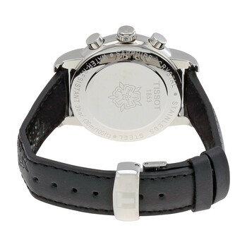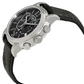Silver-tone stainless steel case with a black synthetic leather strap. Fixed silver-tone stainless steel bezel. Black dial with silver-tone hands and index hour markers. Arabic numerals mark the 3, 6, 9 and 12 o'clock positions. minute markers around the inner ring. Dial Type: Analog. Date display at the 4 o'clock position. Chronograph - three sub-dials displaying: 60 second, 30 minute and 1/10th of a second. ETA Caliber G15.211 quartz movement. Scratch resistant sapphire crystal. Pull / push crown. Solid case back. Round case shape, case size: 35 mm, case thickness: 10 mm. Band width: 18 mm. Butterfly clasp. Water resistant at 30 meters / 100 feet. Functions: chronograph, date, hour, minute, second. Sport watch style. Watch label: Swiss Made. Tissot Dressport Black Dial Ladies Watch T0502171705700.