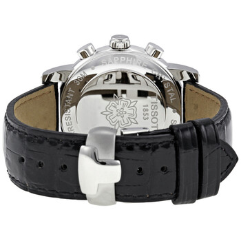 Stainless steel case with a black leather strap. Fixed silver-tone bezel set with crystals. Black dial with silver-tone hands and Arabic numeral hour markers. Minute markers appear around the outter rim. Dial Type: Analog. Date display at the 4 o'clock position. Chronograph - three sub-dials displaying: 30 minutes, 60 seconds and 1/10 seconds. Quartz movement. Scratch resistant sapphire crystal. Screw down crown. Solid case back. Case diameter: 35 mm. Case thickness: 10 mm. Fold over clasp. Water resistant at 30 meters / 100 feet. Functions: hours, minutes, seconds, 1/10 seconds, chronograph and date. Casual watch style. Watch label: Swiss Made. Tissot Dressport Chronograph Black Leather Ladies Watch T0502171605201.