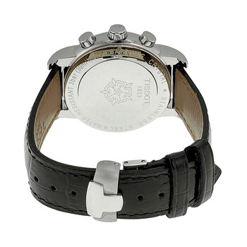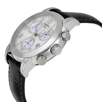 Stainless steel case with a black leather strap. Fixed stainless steel bezel. Mother of pearl dial with silver-tone hands and Arabic numeral hour markers. Minute markers around the outer rim. Dial Type: Analog. Date display at the 4 o'clock position. Chronograph - three sub-dials displaying: 60 seconds, 30 minutes and 1/10th of a second. Quartz movement. Scratch resistant sapphire crystal. Textured steel crown. Solid case back. Case diameter: 35 mm. Case thickness: 10 mm. Round case shape. Band width: 17.8 mm. Band length: 7 inches. Butterfly clasp. Water resistant at 30 meters / 100 feet. Functions: chronograph, date, hour, minute, second. Sport watch style. Watch label: Swiss made. Item Variations: T0502171611200. Tissot Dressport Chronograph Mother of Pearl Dial Black Leather Ladies Watch T050.217.16.112.00.
