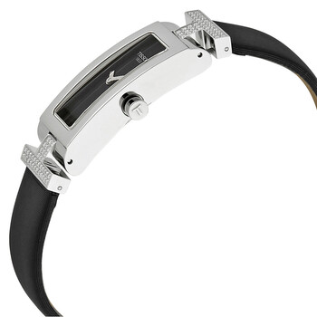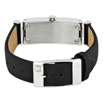 Silver-tone stainless steel case with a black fabric strap. Fixed- diamond set bezel. Black dial with silver-tone hands. Dial Type: Analog. Quartz movement. Pull / push crown. Solid case back. Rectangle case shape. Case size: 13.8 mm. Functions: hour, minute. Dress watch style. Watch label: Swiss Made. Tissot Equi-T Black Dial Ladies Diamond Watch T58.1.325.50.