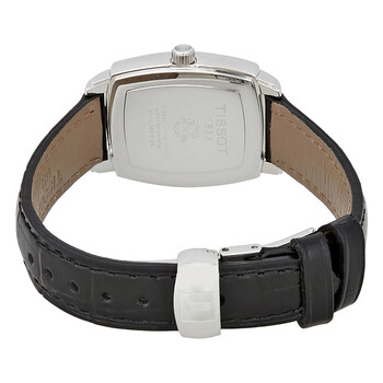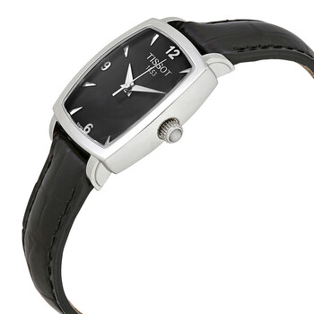 Silver-tone stainless steel case with a black (calfskin) leather strap. Fixed silver-tone stainless steel bezel. Black dial with silver-tone hands and index hour markers. Arabic numerals mark the 6, 9 and 12 o'clock positions. Dial Type: Analog. Date display at the 3 o'clock position. ETA caliber F03.111 quartz movement. Scratch resistant sapphire crystal. Pull / push crown. Solid case back. Case size: 25 mm. Case thickness: 7.7 mm. Tonneau case shape. Band width: 11 mm. Butterfly clasp. Water resistant at 30 meters / 100 feet. Functions: date, hour, minute, second. Dress watch style. Watch label: Swiss Made. Item Variations: T0579101605700. Tissot Everytime Black Dial Black Leather Ladies Watch T057.910.16.057.00.