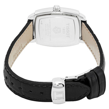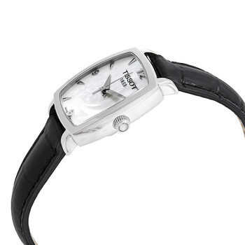 Stainless steel case with a black leather strap. Fixed stainless steel bezel. Mother of pearl dial with silver-tone hands and index hour markers. Arabic numerals mark the 6, 9 and 12 o'clock positions. Dial Type: Analog. Date display at the 3 o'clock position. ETA caliber F03.111 quartz movement. Scratch resistant sapphire crystal. Screw down crown. Solid case back. Tonneau case shape. Case size: 24.5 mm. Case thickness: 7.7 mm. Band width: 13 mm. Tang clasp. Water resistant at 30 meters / 100 feet. Functions: date, hour, minute, second. Additional Info: withstands rain and splashes of water, but not showering or submersion. Casual watch style. Watch label: Swiss Made. Tissot Everytime Mother of Pearl Dial Ladies Watch T057.910.16.117.00.