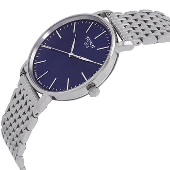 Silver-tone stainless steel case and bracelet. Fixed silver-tone stainless steel bezel. Blue dial with silver-tone hands and index hour markers. Minute markers around the outer rim. Dial Type: Analog. ETA Caliber F06.412 quartz movement. Scratch resistant sapphire crystal. Pull / push crown. Solid case back. Round case shape, case size: 40 mm, case thickness: 7.1 mm. Band width: 20 mm. Butterfly clasp with push-buttons. Water resistant at 50 meters / 165 feet. Functions: hour, minute, second. Everytime Series. Casual watch style. Watch label: Swiss Made. Tissot Everytime Quartz Blue Dial Men's Watch T143.410.11.041.00.