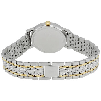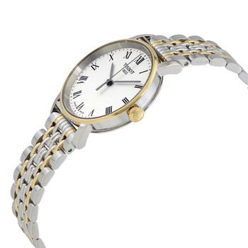 Stainless steel case with a two-tone (silver-tone and yellow gold PVD ) stainless steel bracelet. Fixed yellow gold PVD bezel. Silver dial with black hands and Roman numeral hour markers. Minute markers around the outer rim. Dial Type: Analog. ETA caliber 902.101 quartz movement. Scratch resistant sapphire crystal. Pull / push crown. Solid case back. Round case shape. Case size: 30 mm. Case thickness: 6.15 mm. Band width: 15 mm. Jewelry clasp. Water resistant at 30 meters / 100 feet. Functions: hour, minute, second, battery eol indicator. Casual watch style. Watch label: Swiss Made. Tissot Everytime Quartz Silver Dial Ladies Watch T109.210.22.033.00.