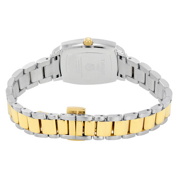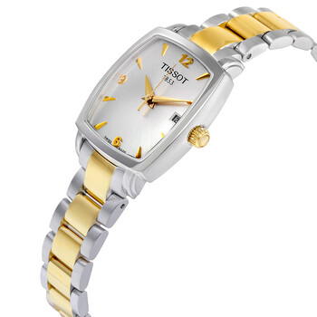 Stainless steel case with a two-tone (silver-tone and yellow gold PVD) stainless steel bracelet. Fixed stainless steel bezel. Silver dial with yellow gold-tone hands and index hour markers. Arabic numerals mark the 6, 9 and 12 o'clock positions. Dial Type: Analog. Date display at the 3 o'clock position. ETA caliber F04.111 quartz movement. Scratch resistant synthetic sapphire crystal. Pull / push crown. Solid case back. Case dimensions: 24.7 mm x 28 mm. Case thickness: 7.7 mm. Tonneau case shape. Band width: 20 mm. Deployment clasp with a push button release. Water resistant at 30 meters / 100 feet. Functions: date, hour, minute, second. Casual watch style. Watch label: Swiss Made. Tissot Everytime Silver Dial Two-tone Watch T0579102203700.