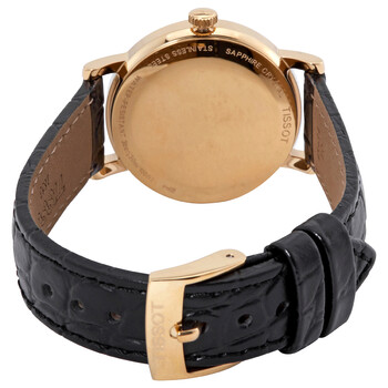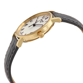 Yellow gold PVD stainless steel case with a black leather strap. Fixed yellow gold PVD stainless steel bezel. Silver dial with grey hands and Roman numeral hour markers. Minute markers around the outer rim. Dial Type: Analog. ETA 902.101 quartz movement. Scratch resistant sapphire crystal. Pull / push crown. Solid case back. Round case shape. Case size: 30 mm. Case thickness: 6.2 mm. Band width: 15 mm. Tang clasp. Water resistant at 30 meters / 100 feet. Functions: hour, minute, second. Casual watch style. Watch label: Swiss Made. Tissot Everytime Small Quartz Silver Dial Ladies Watch T109.210.36.033.00.