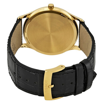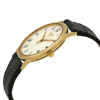 18kt yellow gold case with a black leather strap. Fixed 18kt yellow gold bezel. Silver opalin dial with yellow gold-tone hands and Roman numeral hour markers. Minute markers around the outer rim. Dial Type: Analog. ETA caliber 902.101 quartz movement. Scratch resistant sapphire crystal. Pull / push crown. Solid case back. Round case shape. Case size: 40 mm. Case thickness: 5.85 mm. Band width: 22 mm. Tang clasp. Water resistant at 30 meters / 100 feet. Functions: hour, minute, second. Casual watch style. Watch label: Swiss Made. Tissot Excellence Silver Dial 18kt Yellow Gold Men's Watch T926.410.16.013.00.