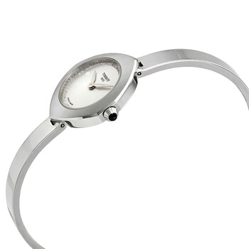 Stainless steel case with a stainless steel bracelet. Fixed stainless steel bezel. Silver diamond-set dial with silver-tone hands. Dial Type: Analog. ETA Caliber 901.001 quartz movement. Scratch resistant sapphire crystal. Pull / push crown. Solid case back. Cushion case shape. Case size: 23 mm. Case thickness: 6.05 mm. Butterfly clasp. Water resistant at 30 meters / 100 feet. Functions: hour, minute. Dress watch style. Watch label: Swiss Made. Tissot Femini-T Diamond Silver Dial Ladies Watch T113.109.11.036.00.