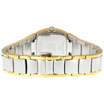 Stainless steel case with a two-tone (silver and gold PVD) stainless steel bracelet. Fixed bezel. White mother of pearl dial with gold-tone hands and dot hour markers. Arabic numerals mark the 6 and 12 o'clock positions. Dial Type: Analog. Quartz movement. Eta f03.311 engine. Scratch resistant sapphire crystal. Solid case back. Case diameter: 26.9 mm. Deployment clasp. Water resistant at 30 meters / 100 feet. Functions: hours, minutes, seconds. Casual watch style. Tissot Femini-t Mother of Pearl Stainless Steel Ladies Watch T0533102201700.