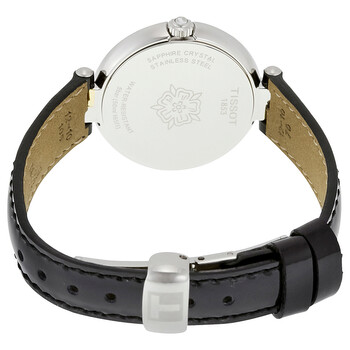 Gold PVD stainless steel case with a black leather strap. Fixed gold PVD bezel. White mother of pearl dial with gold-tone hands and index hour markers. Dial Type: Analog. Date display above the 6 o'clock position. ETA caliber F03.111 quartz movement. Scratch resistant sapphire crystal. Pull / push crown. Solid case back. Case size: 26 mm. Case thickness: 6.35 mm. Round case shape. Fold over clasp. Water resistant at 50 meters / 165 feet. Functions: date, hour, minute, second. Dress watch style. Watch label: Swiss Made. Tissot Flamingo Mother of Pearl Dial Ladies Watch T094.210.26.111.00.