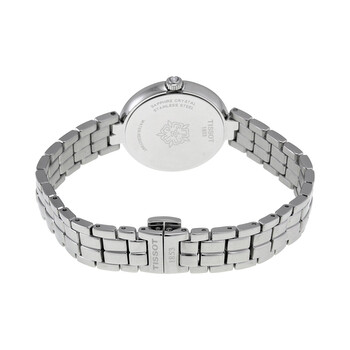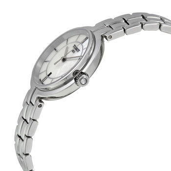 Stainless steel case with a stainless steel bracelet. Fixed stainless steel bezel. Mother of pearl dial with silver-tone hands and index hour markers. Dial Type: Analog. Date display at the 6 o'clock position. Quartz movement. Scratch resistant sapphire crystal. Pull / push crown. Solid case back. Case diameter: 26 mm. Case thickness: 6.35 mm. Round case shape. Butterfly clasp with a push button release. Water resistant at 50 meters / 165 feet. Functions: date, hour, minute, second. Dress watch style. Watch label: Swiss Made. Tissot Flamingo Mother of Pearl Dial Stainless Steel Ladies Quartz Watch T0942101111100.