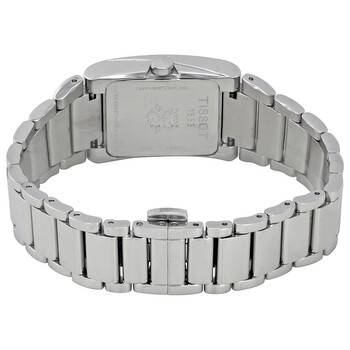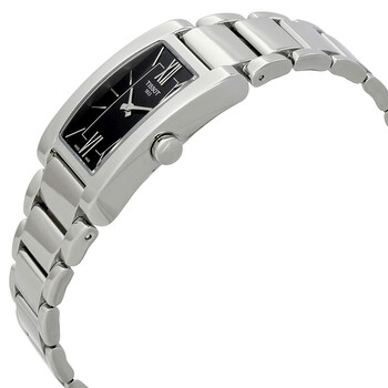 Stainless steel case with a stainless steel bracelet. Fixed stainless steel bezel. Black dial with silver-tone hands and index hour markers. Roman numerals amrk the 6 and 12 o'clock positions m. Dial Type: Analog. Date display at the 3 o'clock position. Quartz movement. Scratch resistant sapphire crystal. Pull / push crown. Solid case back. Case dimensions: 27.5 mm x 24 mm. Case thickness: 7.55 mm. Rectangle case shape. Bracelet width: 15 mm. Butterfly clasp with a push button release. Water resistant at 30 meters / 100 feet. Functions: date, hour, minute, second. Dress watch style. Watch label: Swiss Made. Tissot Generosi-T Black Dial Ladies Watch T105.309.11.058.00.