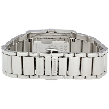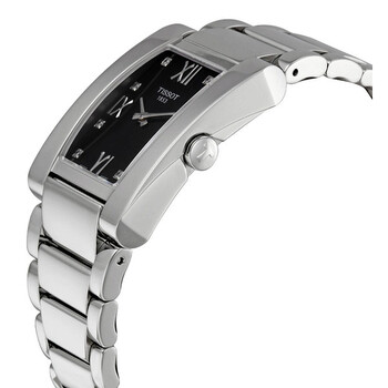 Stainless steel case with a stainless steel bracelet. Fixed stainless steel bezel. Black dial with silver-tone hands and diamond hour markers. Roman numerals mark the 3, 6, 9 and 12 o'clock positions. Date display at the 3 o'clock position. Quartz movement. Scratch resistant sapphire crystal. Steel crown. Solid case back. Case dimensions: 24.5 mm x 27.5 mm. Case thickness: 7.5 mm. Fold over clasp with a push button release. Water resistant at 30 meters / 100 feet. Functions: hours, minutes. Tissot Generosi-T Diamond Ladies Watch T0073091105600.