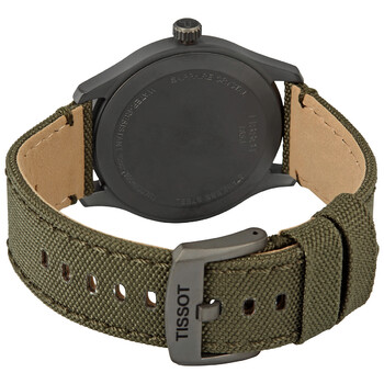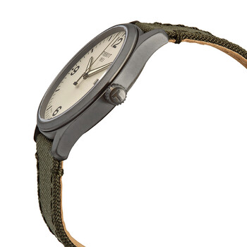 Grey PVD stainless steel case with a olive green (synthetic) fabric strap. Fixed grey PVD bezel. Beige dial with luminous black hands and index hour markers. Arabic numerals appear at the 3, 6, 9 and 12 o'clock positions. Minute markers around the outer rim. Dial Type: Analog. Luminescent hands. Date display at the 3 o'clock position. Caliber ETA F06.115 quartz movement. Scratch resistant sapphire crystal. Solid case back. Round case shape. Case size: 42 mm. Case thickness: 8.9 mm. Band width: 22 mm. Tang clasp. Water resistant at 100 meters / 330 feet. Functions: date, hour, minute, second. Gent Xl Series. Casual watch style. Watch label: Swiss Made. Tissot Gent XL Quartz Beige Dial Olive Green Fabric Men's Watch T116.410.37.267.00.