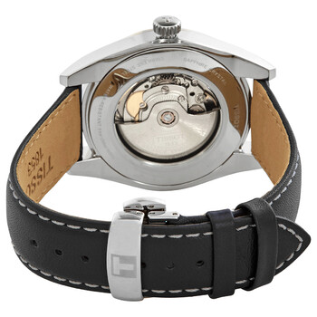 Stainless steel case with a black leather strap. Fixed 18kt yellow gold bezel. Black dial with luminous yellow gold-tone hands and index hour markers. Minute markers around the outer rim. Dial Type: Analog. Luminescent hands and markers. Date display at the 3 o'clock position. Automatic movement. Scratch resistant sapphire crystal. Transparent case back. Round case shape. Case size: 40 mm. Case thickness: 10.6 mm. Band width: 20 mm. Butterfly clasp. Water resistant at 50 meters / 165 feet. Functions: date, hour, minute, second. Gentleman Series. Casual watch style. Watch label: Swiss Made. Tissot Gentleman Automatic Black Dial Men's Watch T927.407.46.061.01.