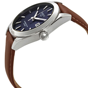 Stainless steel case with a brown leather strap. Fixed stainless steel bezel. Blue dial with luminous silver-tone hands and index hour markers. Minute markers around the outer rim. Dial Type: Analog. Luminescent hands and markers. Date display at the 3 o'clock position. Powermatic 80.111 automatic movement, containing 23 Jewels, bitting at 28800 vph, and has a power reserve of approximately 80 hours. Scratch resistant sapphire crystal. Pull / push crown. Transparent case back. Round case shape. Case size: 40 mm. Case thickness: 11.5 mm. Band width: 21 mm. Butterfly clasp. Water resistant at 100 meters / 330 feet. Functions: date, hour, minute, second. Gentleman series. Casual watch style. Watch label: Swiss Made. Tissot Gentleman Automatic Blue Dial Men's Watch T127.407.16.041.00.