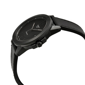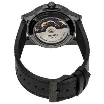Black PVD stainless steel case with a black leather strap. Fixed black PVD bezel. Black dial with luminous dark grey hands and Arabic numeral hour markers. Minute markers around the outer rim. Dial Type: Analog. Luminescent hands. Date display at the 3 o'clock position. Swissmatic automatic movement with a 72-hour power reserve. Scratch resistant sapphire crystal. Transparent case back. Round case shape, case size: 44 mm, case thickness: 12.35 mm. Band width: 21 mm. Tang clasp. Water resistant at 100 meters / 330 feet. Functions: date, hour, minute, second. Dress watch style. Watch label: Swiss Made. Tissot Gentleman Black Dial Black Leather Men's Watch T098.407.36.052.00.