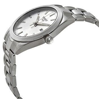 Stainless steel case with a stainless steel bracelet. Fixed stainless steel bezel. Silver dial with luminous silver-tone hands and index hour markers. Minute markers around the outer rim. Dial Type: Analog. Luminescent hands and markers. Date display at the 3 o'clock position. ETA caliber F06.115 quartz movement. Scratch resistant sapphire crystal. Pull / push crown. Solid case back. Round case shape. Case size: 40 mm. Case thickness: 8.52 mm. Band width: 21 mm. Butterfly clasp. Water resistant at 100 meters / 330 feet. Functions: date, hour, minute, second. Casual watch style. Watch label: Swiss Made. Tissot Gentleman Quartz Silver Dial Men's Watch T127.410.11.031.00.