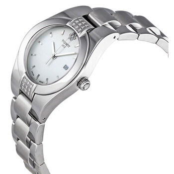 Stainless steel case with a stainless steel bracelet. Fixed stainless steel bezel set with diamonds. Silver dial with silver-tone hands and index hour markers. Dial Type: Analog. Luminescent hands and markers. Date display at the 3 o'clock position. Quartz movement. Scratch resistant sapphire crystal. Screw down crown. Solid case back. Case diameter: 32 mm. Case thicknes: 8.2 mm. Round case shape. Bracelet width: 12 mm. Deployment clasp with push button release. Water resistant at 100 meters / 330 feet. Functions: date, hour, minute, second. Casual watch style. Watch label: Swiss Made. Tissot Glam Sport Limited Edition Silver Stainless Steel Ladies Watch T0432101103100.