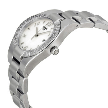 Stainless steel case with a stainless steel bracelet. Fixed stainless steel bezel set with 48 diamonds. Mother of pearl dial with silver-tone hands and alternating dot and Arabic numeral hour markers. Dial Type: Analog. Date display at the 3 o'clock position. Quartz movement. Scratch resistant sapphire crystal. Pull / push crown. Solid case back. Case diameter: 32 mm. Case thickness: 9 mm. Round case shape. Band width: 17 mm. Fold over clasp. Water resistant at 50 meters / 165 feet. Functions: date, hour, minute, second. Casual watch style. Watch label: Swiss Made. Item Variations: T043 210 11 117 01, T043-210-11-117-01, T043/210/11/117/01, T0432101111701. Tissot Glam Sport Mother of Pearl Dial Stainless Steel Ladies Watch T0432101111701.