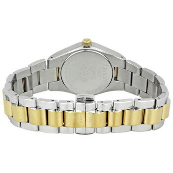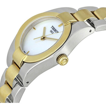 Stainless steel case with a two-tone (silver and gold-tone) stainelss steel link bracelet. Fixed gold-tone bezel. Mother of pearl dial with gold-tone hands and stick markers at the quarter hour positions. Quartz movement. Scratch resistant sapphire crystal. Tecturose gold-tone crown. Solid case back. Case diameter: 28 mm. Case thickness: 8.2 mm. Deployment clasp with push button release. Water resistant at 50 meters/ 165 feet. Functions: hours, minutes, seconds. Tissot Glam Sport Mother of Pearl Ladies Watch T0430102211100.
