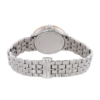 Silver-tone stainless steel case and bracelet. Fixed 18kt rose gold bezel. Blue dial with rose gold-tone hands and index-diamond hour markers. Minute markers around the outer rim. Dial Type: Analog. Date display at the 6 o'clock position. Renata 371 quartz movement. Scratch resistant sapphire crystal. Pull / push crown. Solid case back. Round case shape, case size: 33 mm, case thickness: 7.6 mm. Band width: 16 mm. Butterfly clasp. Water resistant at 30 meters / 100 feet. Functions: date, hour, minute, second. Glendora Series. Dress watch style. Watch label: Swiss Made. Tissot Glendora Quartz Diamond Blue Dial Ladies Watch T929.210.41.046.00.