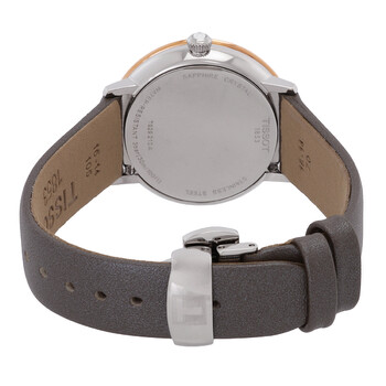 Silver-tone stainless steel case with a leather strap. Fixed 18kt rose gold bezel. Cream opalin dial with rose gold-tone hands and index hour markers. Minute markers around the outer rim. Dial Type: Analog. Date display at the 6 o'clock position. ETA Caliber F05.115 quartz movement. Scratch resistant sapphire crystal. Solid case back. Round case shape, case size: 33 mm, case thickness: 7.6 mm. Band width: 16 mm. Deployment with push button release clasp. Water resistant at 30 meters / 100 feet. Functions: date, hour, minute, second. Additional Info: dial set with 4 top wesseltom diamonds with vs-si clarity, 0.0120 ct. Glendora Series. Dress watch style. Watch label: Swiss Made. Tissot Glendora Quartz Diamond Cream Opalin Dial Ladies Watch T929.210.46.266.00.