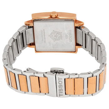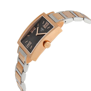 Stainless steel case with a two-tone (silver-tone and rose gold-tone) stainless steel bracelet. Fixed rose gold-tone bezel. Black dial with rose gold-tone hands and index hour markers. Roman numerals appear at the 3, 6, 9 and 12 o'clock positions. Dial Type: Analog. ETA caliber 901.001 quartz movement. Scratch resistant sapphire crystal. Pull / push crown. Solid case back. Square case shape. Case size: 29 mm. Case thickness: 6 mm. Fold over clasp with a push button release. Water resistant at 30 meters / 100 feet. Functions: hours, minutes. Happy Chic Series. Casual watch style. Watch label: Swiss Made. Item Variations: T0343093206800. Tissot Happy Chic Quartz Black Dial Two-tone Ladies Watch T034.309.32.068.00.