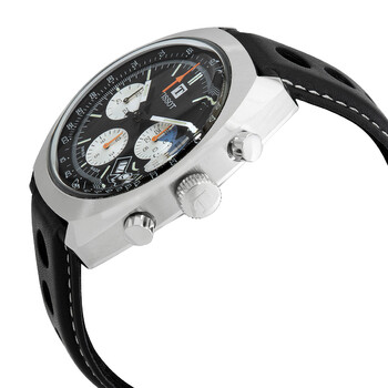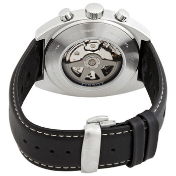 Stainless steel case with a black leather strap. Fixed stainless steel bezel. Black dial with luminous silver-tone hands and index hour markers. Minute markers. Tachymeter markings around the outer rim. Dial Type: Analog. Luminescent hands and markers. Date display between the 4 and 5 o'clock positions. Chronograph - three sub-dials displaying: 60 second, 30 minute and 12 hour. Caliber VALJOUX A05.H31 automatic movement. Scratch resistant sapphire crystal. Screw down crown. Transparent case back. Tonneau case shape. Case size: 43 mm. Deployment clasp with a push button release. Water resistant at 100 meters / 330 feet. Functions: chronograph, tachymeter, date, hour, minute, second. Heritage Series. Sport watch style. Watch label: Swiss Made. Tissot Heritage Automatic Black Dial Men's Watch T124.427.16.051.00.