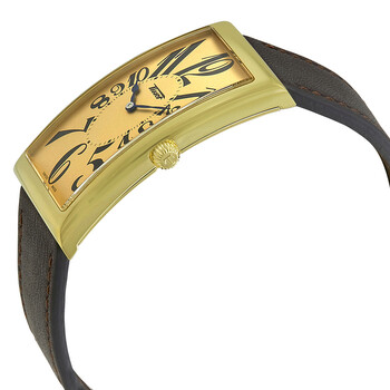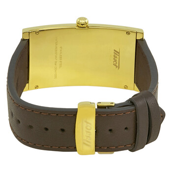 Gold-tone stainless steel case with a brown leather strap. Fixed gold-tone bezel. Champagne dial with silver-tone spade-shaped hands and Arabic numeral hour markers. Minute markers around an inner ring. Dial Type: Analog. ETA caliber 901.001 quartz movement. Scratch resistant domed mineral crystal. Pull / push crown. Solid case back. Rectangle case shape. Case dimensions: 49 mm x 27 mm. Case thickness: 7 mm. Band width: 20 mm. Tang clasp. Water resistant at 30 meters / 100 feet. Functions: hour, minute. Casual watch style. Watch label: Swiss Made. Tissot Heritage Banana Centenary Men's Watch T117.509.36.022.00.